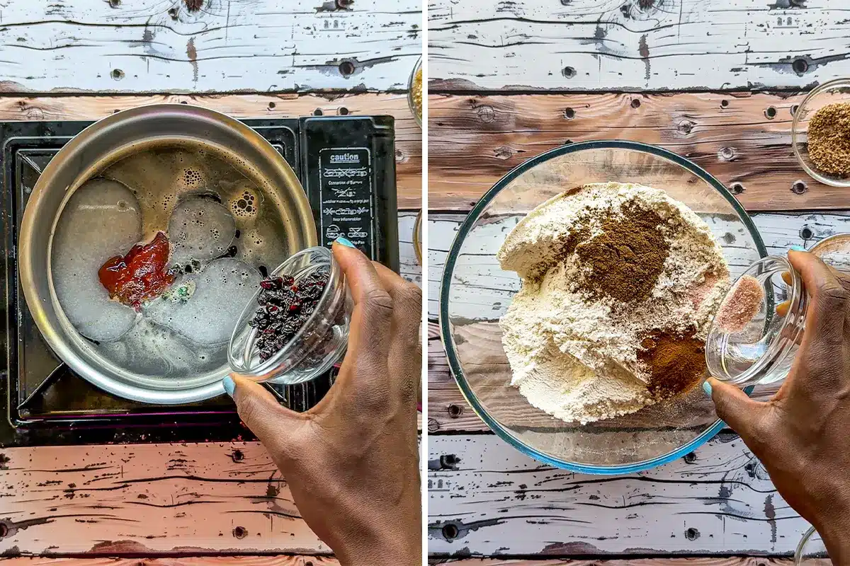 - Prep the wet ingredients: Add all the wet ingredients, except the vanilla extract, to a small pot along with the dried fruits and brown sugar. If you are using fresh ginger as I do, add it to the pot. Place over medium heat until the butter melts. Stir until the sugar dissolves, then set aside until the liquid mixture is back to room temperature.
